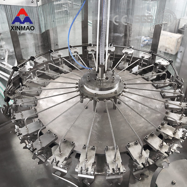 2)沖洗瓶口采用先進的卡瓶頸技術,避免與螺紋口的接觸,更衛生,瓶子的輸送全部采用卡瓶頸技術,變換瓶形無需調整高度,只需變換瓶身直徑相關的護板。