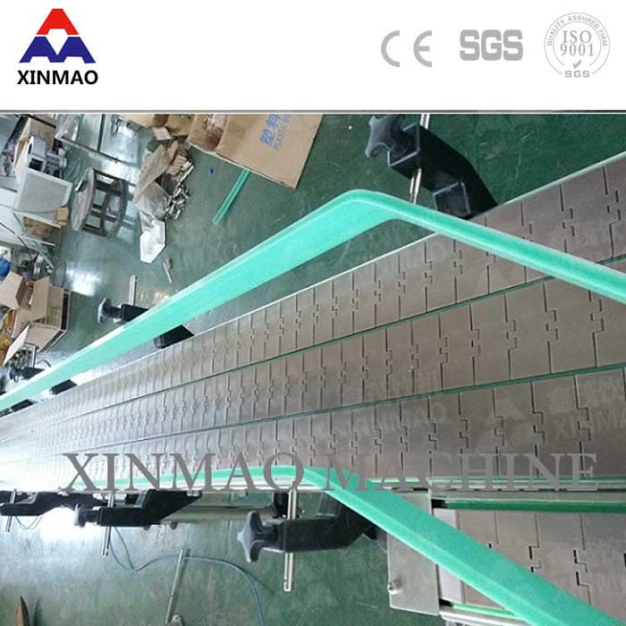 輸送系統鏈板輸送機的輸送面平坦光滑、摩擦力小,物料在輸送線之間的過渡平穩,可輸送各類玻璃瓶、PET瓶、易拉罐等物料,也可輸送各類箱包;