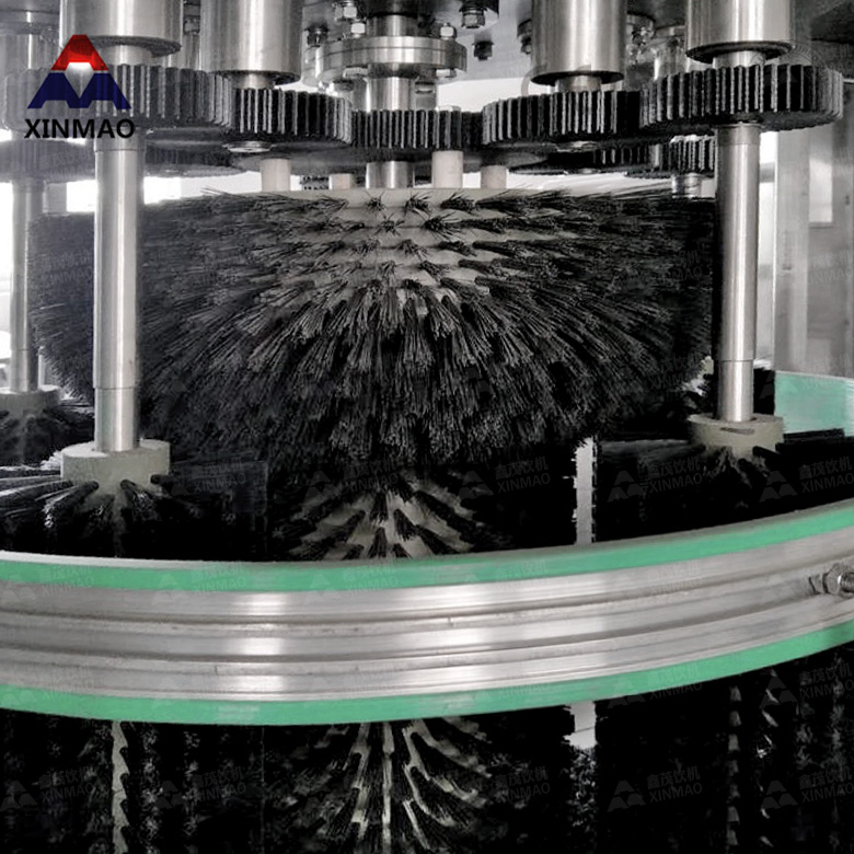 大桶全套純凈水生產線的外桶清洗機由不銹鋼機架、封板(不銹鋼〉、主旋轉毛刷、毛刷調速電機、撥輪調速電機、捅底部旋轉毛刷、撥輪結構、 沖洗水泵、噴淋室等組成。整體采用優質不銹鋼制作,耐腐蝕,易清洗。主要氣路原件均采用臺灣亞德克產品,該機結構緊湊, 工作效率高且穩定可靠,自動化程度高,操作簡單。