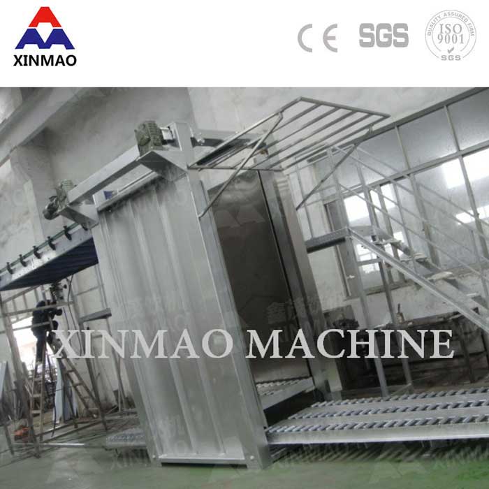 工作時由叉車將疊滿的棧板置于棧板輸送機上,然后輸送機再將之輸送至主機的棧板升降臺上。棧板升降臺是將定位后的空罐棧板升送至卸罐高度,當卸完空罐后,再將空棧板降下置于輸送機上。所有上升、下降的動作全部由自鎖式升降系統裝置控制,并能單獨調整上升或下降的速度,以配合操作上的需要。 卸空罐是由氣缸裝置進行推罐,當空罐送至卸罐高度后擋罐部件的氣缸動作擋住前排空罐,以防空罐倒罐現象,將整層的空罐推至網式輸送機上,然后擋罐部件自動翻轉,回歸至準備位置,繼續將下一層推出。卸完空罐后的空棧板,藉由空棧板輸送機移出。
