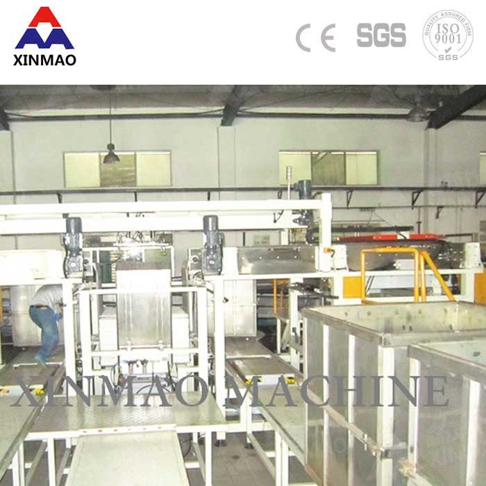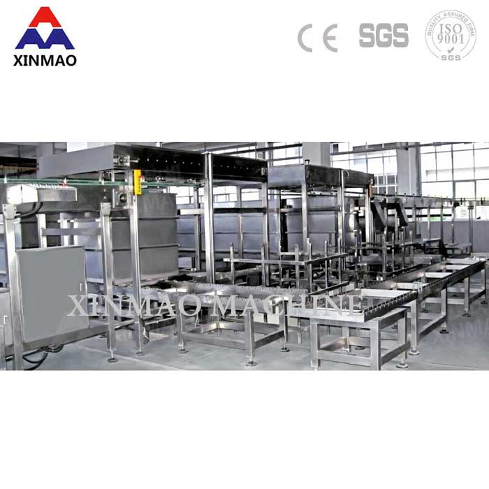 卸籠部分:籠框上的罐體通過四面環抱式推罐/瓶機構自動推送到緩沖網帶上,而獨特的設計結構確保推罐時隔板不被推出,并可實現自動取出隔板功能。